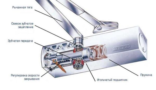 Основной элемент конструкции доводчик для двери — пружина, которая толкает рычаг. По способу передачи усилия от пружины к рычагу бывают устройства двух типов: