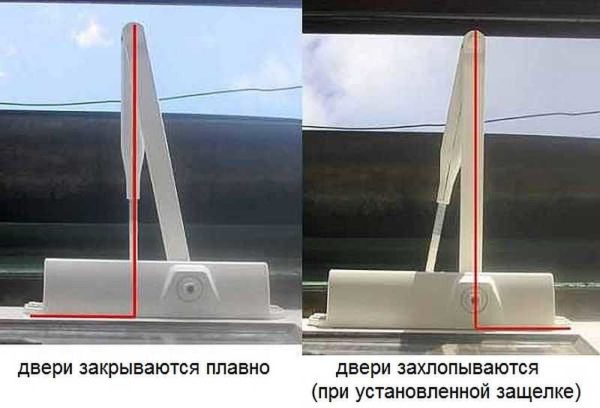 Если необходима просто плавная доводка, тягу ставят так, чтобы она была перпендикулярна дверному полотну. Для этого немного уменьшают ее размеры (на фото слева).