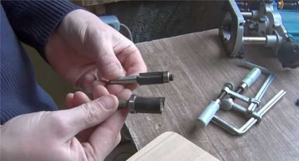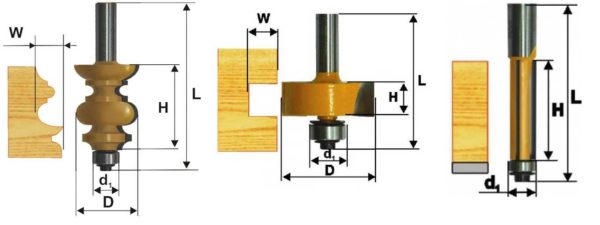 Фрезы — это режущий инструмент, который обрабатывает и формирует поверхность. Состоят они из цилиндрической части, которая зажимается цангами в держателе агрегата, и режущей части. Цилиндрическая часть может быть разного диаметра. Выбирайте такой, цанга под который есть в вашем аппарате. Форма и расположение ножей режущей части определяет тот вид, который получает древесина после обработки. В некоторых фрезах (для кромок) есть упорный ролик. Он задает расстояние от режущей поверхности до обрабатываемого материала.