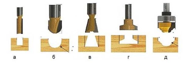 • ласточкин хвост (в, г) — для формирования паза в виде трапеции, это паз используется для открытого и скрытого соединения деталей;