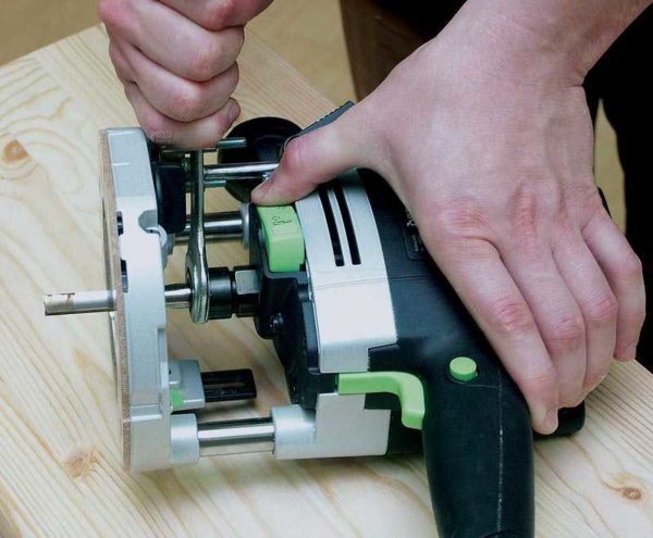 Еще одна важная деталь ручного фрезера — платформа, которая соединяется с корпусом при помощи двух штанг. Платформа обычно сделана из металла. На нижней стороны платформы имеется плита скольжения. Она выполнена из гладкого материала, который обеспечивает плавность хода инструмента при его перемещении по детали.