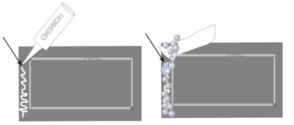 На отделенный участок зеркальной поверхности змейкой наносим силикон. За один раз намазываем небольшой кусочек — прядка 5 см. Быстро распределяем клей по всей поверхности. Сделать это можно кусочком от пластиковой бутылки. На лист бумаги насыпаем бисер, и с него рассеиваем по клею. Расправляем кисточкой, зубочистками. Пальцами не стоит — тяжело отмывать. Наносим клей дальше, продолжая декорирование. Как только обошли все по контуру, снимаете скотч и оставляете сохнуть.