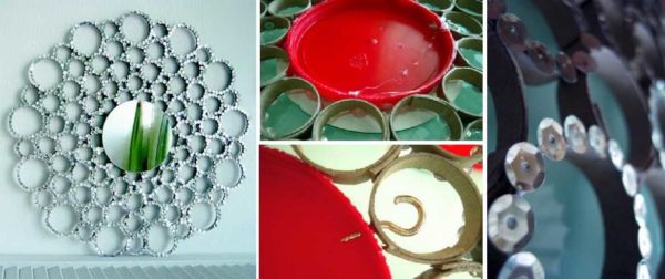 Декор зеркала своими руками делают используя самые различные материалы, в том числе те, которые обычно отправляются в мусорный контейнер, а если покупаются, то стоят совсем немного. Например, трубочки из старых газет или журналов. В некоторых случаях их используют без окрашивания, в других красят. Удобнее краска в виде спрея — наносится ровным тонким слоем, окрашивание происходит в разы быстрее, чем при использовании кисти. Еще можно использовать битую фарфоровую посуду, зеркало, цветное стекло, ракушки, камешки, стразы, стеклянные капли, пуговицы, веревки, пластиковые бутылки, ветки, деревянные планки и палочки, пластиковые ложки и другие странные вещи.