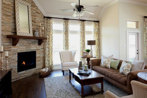 Прованс и Кантри. Этот камин представляет собой кирпичный портал, чем-то напоминающий старые дровяные печи. По сути, он являет собой именно то, что многие из нас представляют при упоминании о камине. Он смотрится очень уютно.