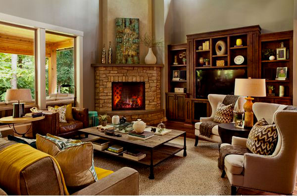 • Угловые камины в интерьере гостиной, фото.