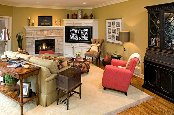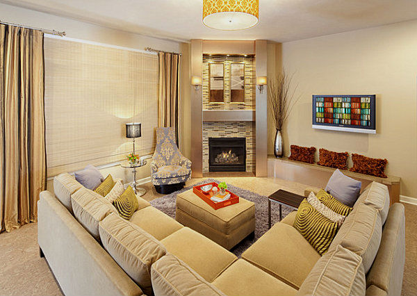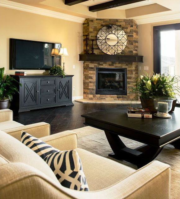 Угловые камины в интерьере гостиной, фото.