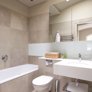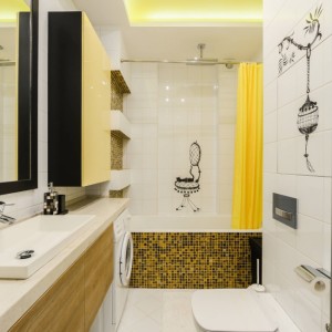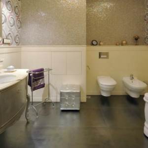Наиболее распространенным материалом для отделки санузла является керамическая плитка. В случае низких потолков не рекомендуется визуально отделять стены при помощи темного низа и светлого верха, лучше выложить от потолка до пола однотонную плитку размером около 200х400 мм, чередующуюся с декоративными вертикальными полосами, зрительно вытягивающими помещение.