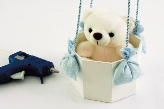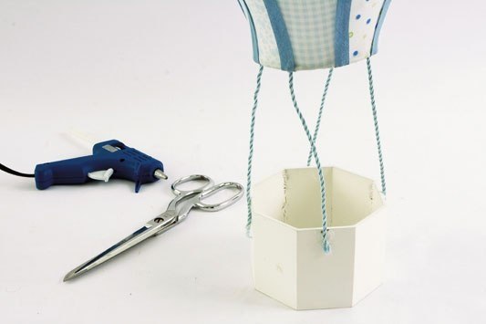 Корзину делаем из картона. Теперь корзину нитками прикрепляем к шару (нитки должны быть одинаковой длины).