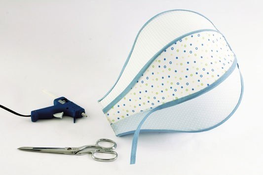 Теперь натягиваем ткань на каркас. После того как ткань ровно ляжет на каркас по ребрам приклеиваем тесьму.