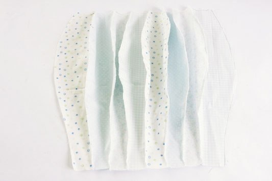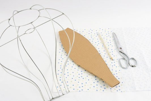 Необходимо из нашей ткани вырезать кусочки, которые будут равны расстоянию между ребрами каркаса (с небольшим припуском на шов). Теперь сшиваем их между собой (если с шитьем у вас туго, кусочки можно просто приклеить к ребрам).