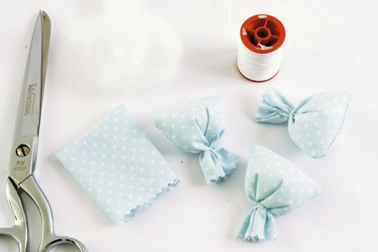 Из имеющихся лоскутков ткани шьем мешочки и наполняем их ватой. Теперь тонкими нитками завязываем мешочки и привязываем к корзине.