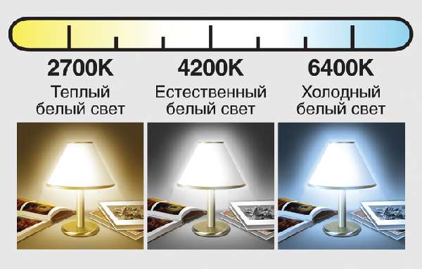 Особенностью LED ламп является такая характеристика, как температура света, которая измеряется в Кельвинах. Чем выше значение, тем «холоднее свет». Выпускаются лампы трёх типов, однако, показатель температуры света у разных производителей может незначительно отличаться: