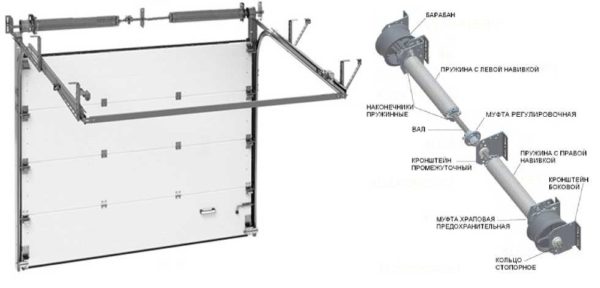 Торсионные пружины располагаются на валу, расположенном в верхней части конструкции