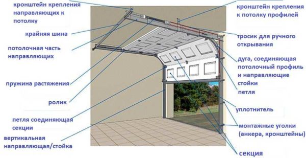 В секционных воротах основное отличие в том, что полотно состоит не из единого полотна, а из набора подвижно соединенных между собой секций. Скрепляются секции между собой специальными петлями, обеспечивающими должную степень свободы. Петель обычно по три на каждое соединение — по краям и в середине (при большой ширине ворот может быть больше). По краям каждой секции установлены ролики. По бокам проема ворот установлены направляющие, которые плавно изогнувшись, переходят в потолочную направляющую. Направляющие имеют выемки, в которые заправляются ролики.