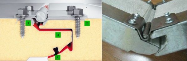 Как уже говорили, между собой сендвич-панели соединяются при помощи петель. Для того, чтобы в месте соединения не образовывалось щелей и не было продувания, края делают фигурными, в виде замка шип/паз, что уменьшает возможность продувания.