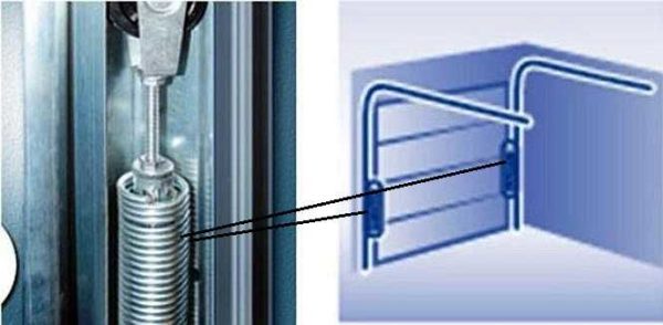 • С пружинами растяжения. Пружины установлены в боковых стойках (направляющих). При подъеме полотна, они растягиваются, при опускании — возвращаются в исходное положение.