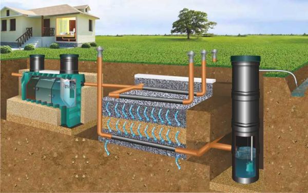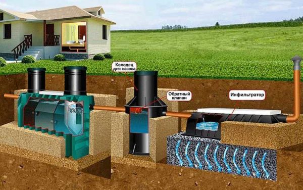 Фактически схема такая-же — с промежуточным колодцем между септиком Танк и устройствами доочистки, но с ощутимой разницей: