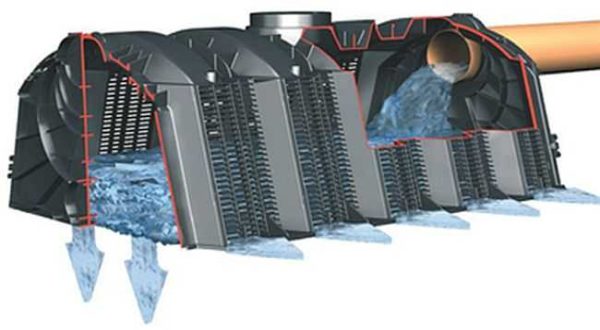 Есть штатный способ отведения воды, разработанный той же фирмой — установка инфильтрора. Инфильтратор — емкость специальной формы, в дне которой имеются многочисленные отверстия через которые условно чистая вода попадает вниз. Устанавливается это устройство на большую щебневую подушку — минимальная толщина ее 40 см (это при нормальной способности грунтов отводить воду, если грунты — глина или суглинок, слой увеличивают). На щебне остаются остатки загрязнений, а чистая вода уходит в грунт.