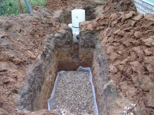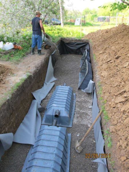 Относительно небольшой по размерам — 1800*800*400 мм, он вмещает в себя до 400 литров жидкости. Укладывается он на щебневую подушку высотой от 40 см. Такой высоты слой щебня необходим на почвах с нормальной способностью отводить воду, на плоходреннируемых грунтах он может быть и 70 см, и больше.