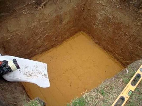 - Копаем котлован. Делать это можно вручную или с использованием техники. Дно выравниваем, насыпаем песок слоем 3-5 см, уплотняем, выравниваем его в уровень.