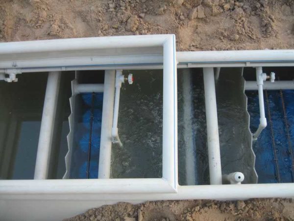 - Стоки попадают в первый резервуар — септик. В нем, как в классическом септике тяжелые частицы оседают на дно, легкие, жиросодержащие подымаются наверх.