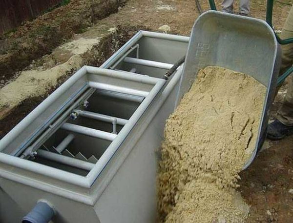 - Продолжают засыпку песком до тех пор, пока корпус не будет засыпан. Верхний слой — подорожная почва, в которую можно высадить траву или цветы.