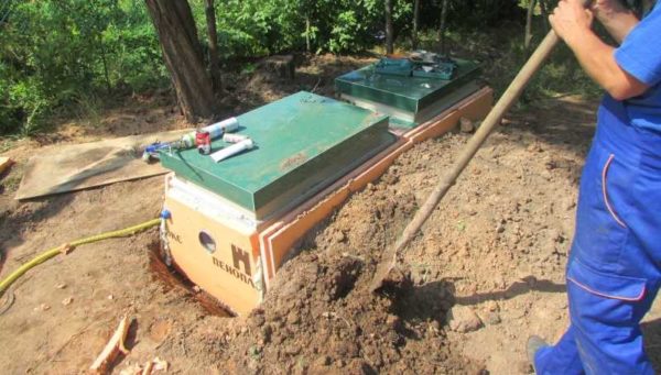 Тип почвы влияет на выбор способ а установки. Если почвы нормально отводят воду (песок, спеси, суглинки с большим количеством песка), септик Тверь засыпают песком. Если в грунте преобладает глина, да еще уровень грунтовых вод высокий, на дне укладывают/заливают бетонную плиту, к которой привязывают корпус септика. При этом засыпают промежуток между стенкой котлована и септика цементно-песчаной смесью (1 к 5).