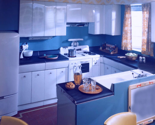 Какими же должны быть стены в кухне? Если планируется монтировать синюю мебель, то стены должны быть светлыми, бежевыми или белыми. Большинство людей, конечно же, предпочтет бежевый оттенок, так как он менее маркий, но зато белый цвет в данном интерьере будет смотреться наиболее выигрышно. Итак, на стены необходимо наклеить бежевые или белые виниловые обои (даже в случае загрязнения, они прекрасно отмываются). В кухню подойдет реечный потолок, который, как и виниловые обои можно убирать, применяя мыльные растворы. Осталось только монтировать наливной пол светлого серого цвета с синими вкраплениями, и можно переходить к меблировке помещения.