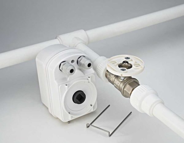 Гидролок называют эту конструкцию шаровые электрокраны или ШЭК. Про шаровые краны было сказано немало. Уточним несколько моментов. Первый: краны полнопроходные. Это значит, что они имеют сечение не менее сечения трубы и не оказывают влияние на поток. Второй: они не создают гидроударов при закрытии и открывании.