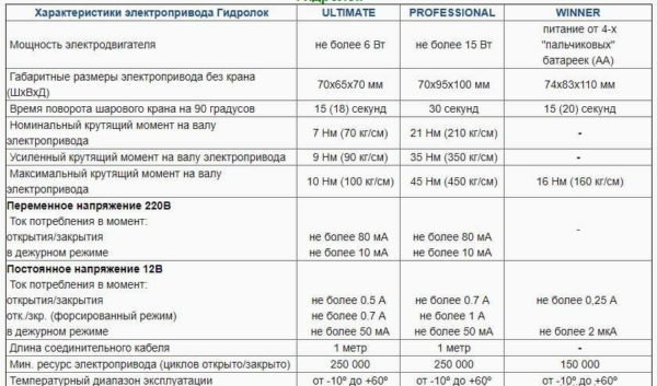 Теперь перейдем к электроприводам, мощности двигателя и величине крутящего момента. На данный момент есть три вида приводов Гидролок: Ultimate, Professional и Winner. Отличаются они мощностью электродвигателя и величиной крутящего момента.