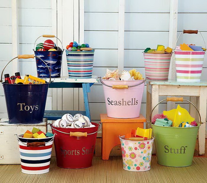 Даже обычные ведра можно приспособить для размещения вещей. Для этого ведра нужно разрисовать яркими красками, подходящими под общий тон интерьера или в контрасте с ним.