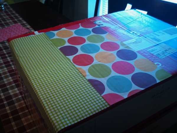 В этом случае все углы коробки можно проклеить скотчем с двух сторон — дольше служить будет. Далее берем ткань и вырезаем по размерам коробки два комплекта заготовок. Один строго по размерам, плюс припуск на швы, второй на 1 см меньше и тоже с припуском. На швы добавляем по 0,5-1 см с каждой стороны. Можно раскроить заготовку сразу с виде креста, но так расход ткани получается больше — отдельными кусками экономнее))