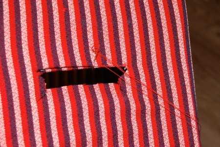 С помощью ножниц прорезаем ручки. Только не вырезайте большие куски. Надо оставить около 1 см «лишней» ткани. Ее заворачиваем внутрь, подшивая ручку.