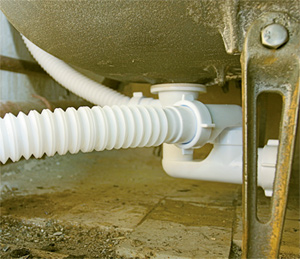 • Далее подключают к канализационной системе водосливную арматуру. Водяной затвор устанавливается на выпускном клапане, к нему приделывается отводящая труба, соединяющая ванну и канализацию.