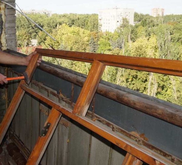 - Демонтаж старого остекления и отделочных материалов на балконе/лоджии (оконный блок в помещение оставляем пока на месте). На балконе остается металлическое ограждение, на лоджии — тонкая стандартная перегородка, если таковая есть. Если на лоджии перегородки нет, остается тоже только металлический каркас. Он необходим для безопасности работ.