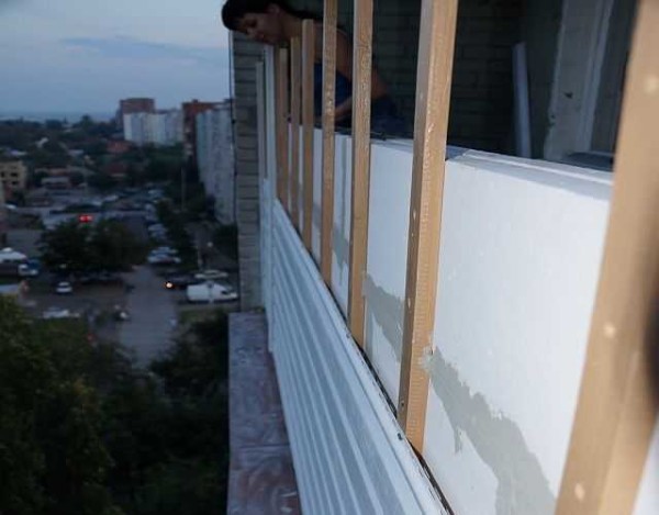 - Если было убрана стандартная отделка балкона или лоджии, параллельно с возведением стенки ее необходимо снаружи обшивать выбранным отделочным материалом. Обычно — сайдингом. Для чего снаружи крепят деревянные бруски, к ним — сайдинг.