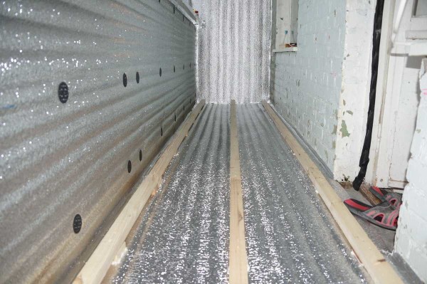 - Утепление пола, стен потолка. Наиболее распространенный вариант утепления — между деревянных брусков обрешетки. Для утепления используют или экструдированный пенополистирол или маты минеральной ваты. Пенополистирол применяется чаще, так как при одинаковой степени теплоизоляции имеет меньшую толщину и не боится намокания (конденсата). Для Средней полосы России толщина пенополистирола должна оставлять 70-100 мм. Укладывают утеплитель в два слоя с перекрытием швов. Крепят специальными пластиковыми дюбелями-зонтиками или приклеивают на монтажную пену.