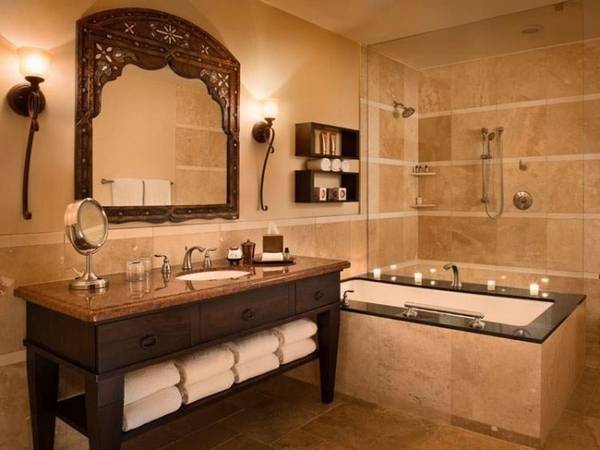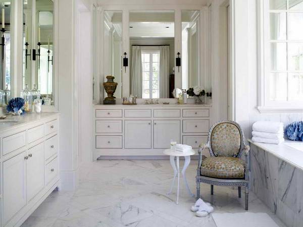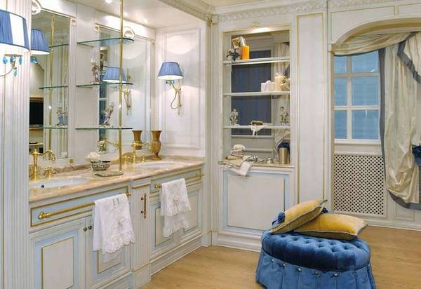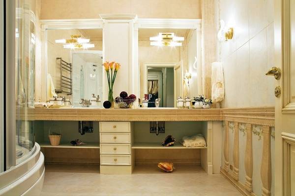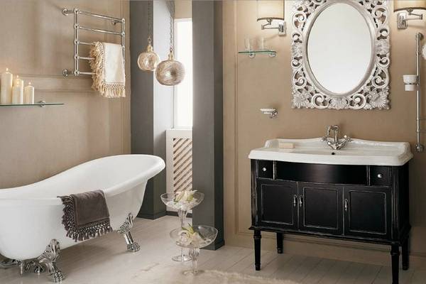 При выборе мебели, в первую очередь, стоит учитывать размеры самого помещения, ведь если у вас городская квартира с небольшой ванной комнатой, это одно дело, а если частный дом — совершенно другое. При наличии большой ванной комнаты, в ней можно разместить не только шкаф для хранения ванных принадлежностей, но и даже одно или два кресла с туалетным столиком. В соответствии с канонами стиля, мебель для ванной комнаты в классическом стиле должна быть изящной и добротной, иметь прямые линии и правильную геометрию. Что касается материала изготовления, то это конечно же ценные породы дерева, однако его можно заменить и более дешевыми аналогами или имитацией дерева.