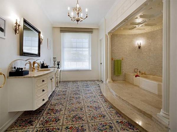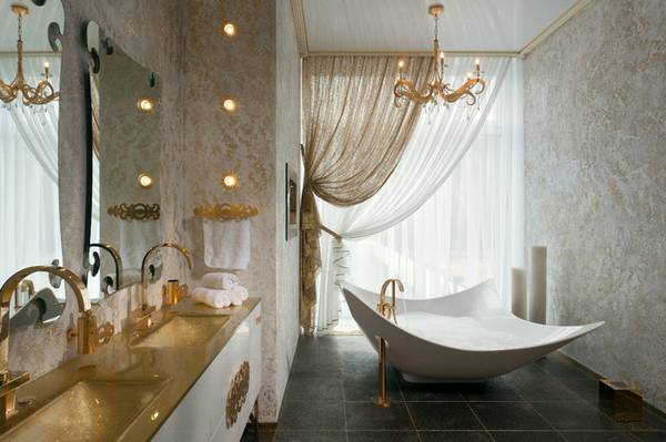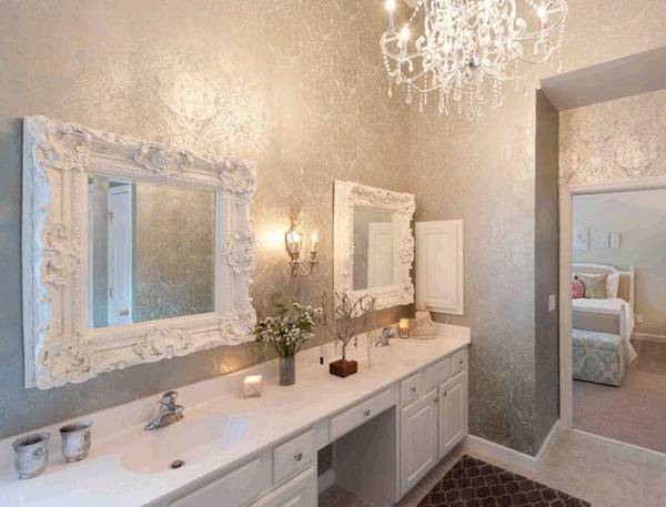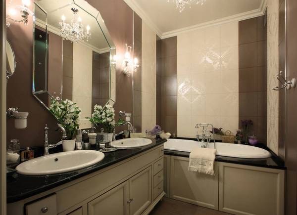 Классическая люстра является не просто осветительным прибором, но и важным элементом интерьера классической ванной комнаты. Она может быть изготовлена из металла, хрусталя или стекла, либо сочетать все эти материалы вместе. Для большой ванной комнаты подойдут подвесные хрустальные люстры или варианты с плафонами округлой формы или в виде цветков. Для ванных комнат с низким потолком можно использовать оригинальные потолочные люстры. Главным требованием к осветительным приборам для ванной комнаты является их влагозащищенность, что должно быть указано в паспорте к изделию. Люстра в ванную комнату в классическом стиле представлена ниже в нашей фото подборке.
