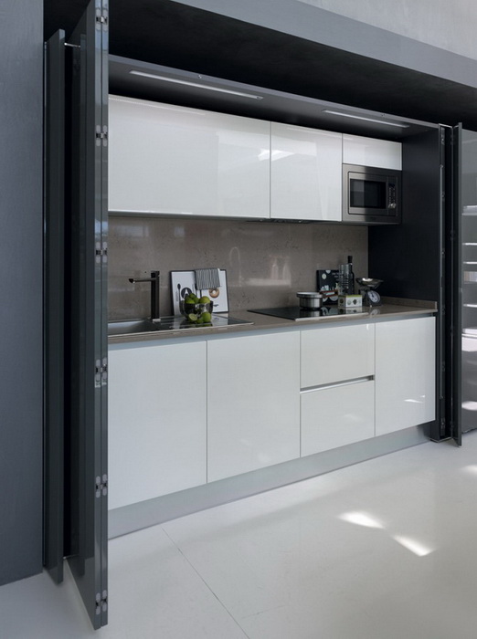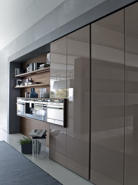 Характерная черта таких кухонных коллекций – навесные и напольные шкафы с непрозрачными фасадами. Они скрывают не только кухонную утварь и другие «бытовые» подробности, но и само назначение мебели.