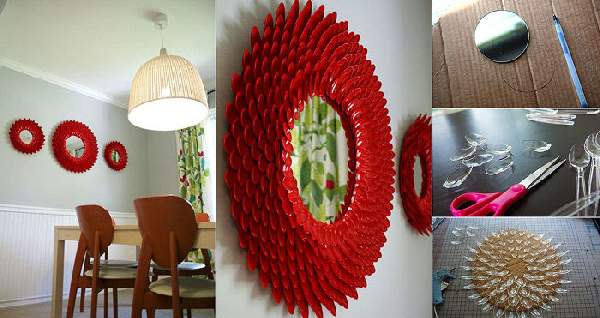 Глядя на пестрые рамки, обрамляющие зеркала, на фото ниже трудно поверить в то, что сделано это чудо своими руками. А ведь технология совершенно проста. Используются для этого самые обыкновенные пластиковые ложки. Такое современное декорирование стен обязательно привлечет к себе взгляд, выступив доминирующим акцентом интерьера, и станет уместным даже для минималистического направления.