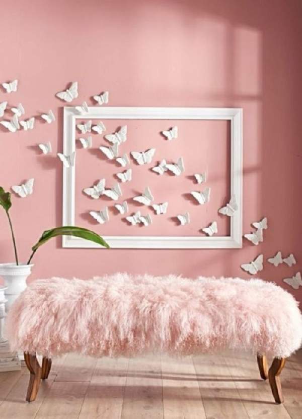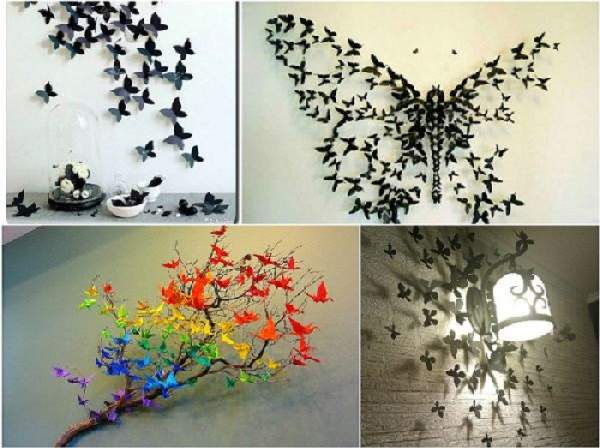 Разноцветные или однотонные скопления искусственных бабочек символизируют лето, тепло, значительно оживляя интерьер. Они, несомненно, вызывают умиление и улыбки. Декорирование квартиры этими милыми существами смотрится эффектно еще за счет их объемности, достигаемой приподнятыми крыльцами. Их можно вырезать из бумаги, картона, ткани и даже газет.