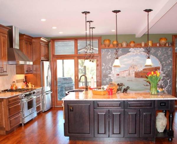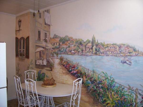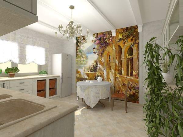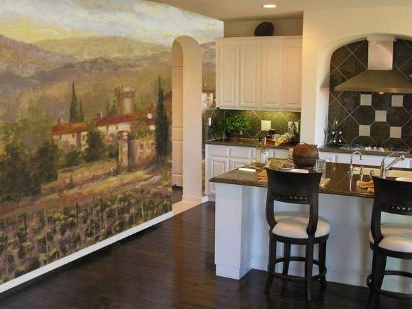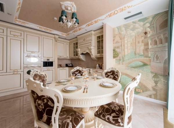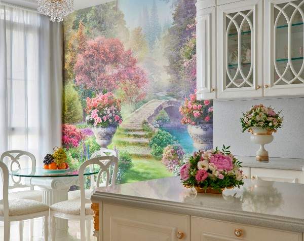 Классический интерьер великолепно гармонирует с подлинными произведениями изобразительного искусства: фресками и картинами. Разумеется, позволить себе такую роскошь может далеко не каждый. На выручку придут фотообои! Они позволят ценителям искусства без лишних затрат разместить на стене качественную репродукцию картины любимого художника или хорошую имитацию фрески. Демократический и стойкий винил продлит жизнь «шедевра» в условиях кухни и облегчит уход за ним.