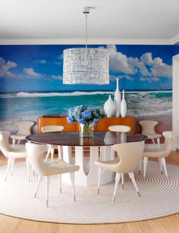 В маленьких помещениях также хороши обои с некрупным фоновым рисунком: фотоснимки растительного мира, морских пейзажей, а также орнаменты и абстракции. Здесь есть небольшой секрет: направление основных линий рисунка помогает изменить геометрические свойства пространства. Преобладание горизонтальных линий на полотне фотообоев «раздвинет» стены, а преимущественно вертикальные линии «поднимут» низкий потолок.
