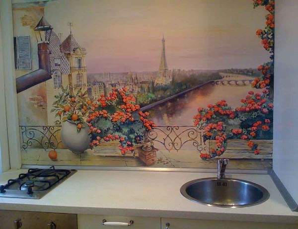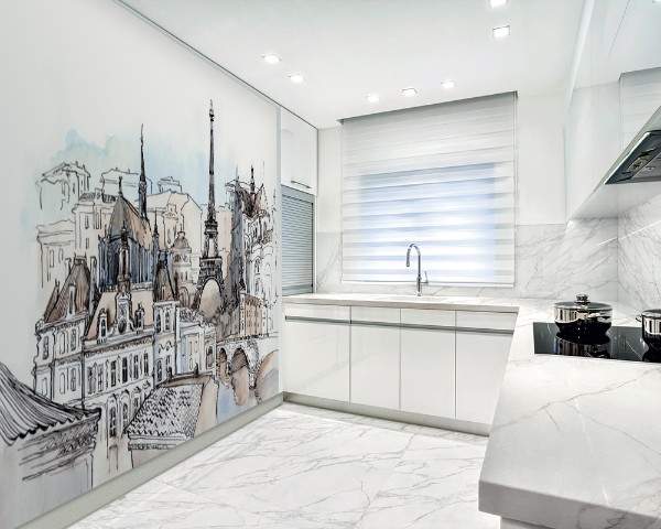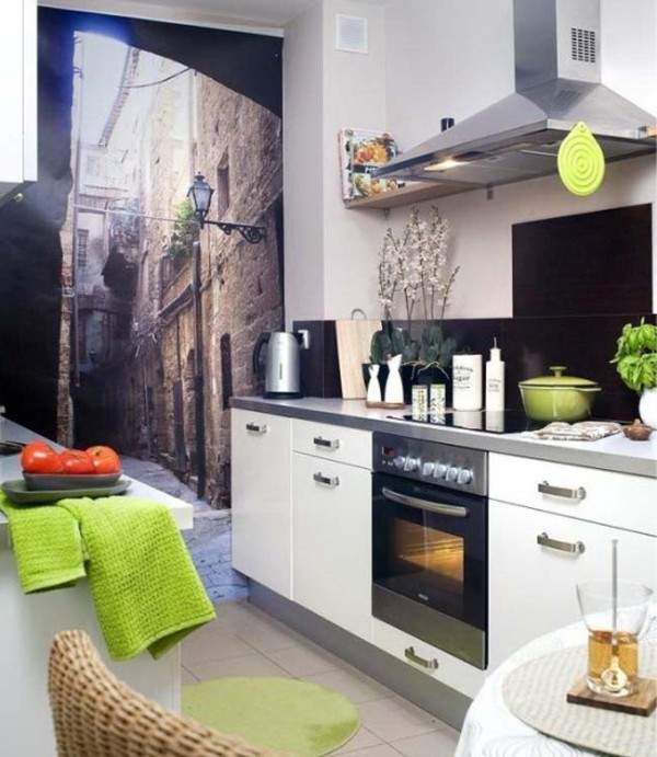 Нетривиальное решение — замена фотообоями плитки в рабочей зоне. Поскольку мыть ее приходится часто и тщательно, даже виниловые обои лучше закрыть стеклянным фартуком.