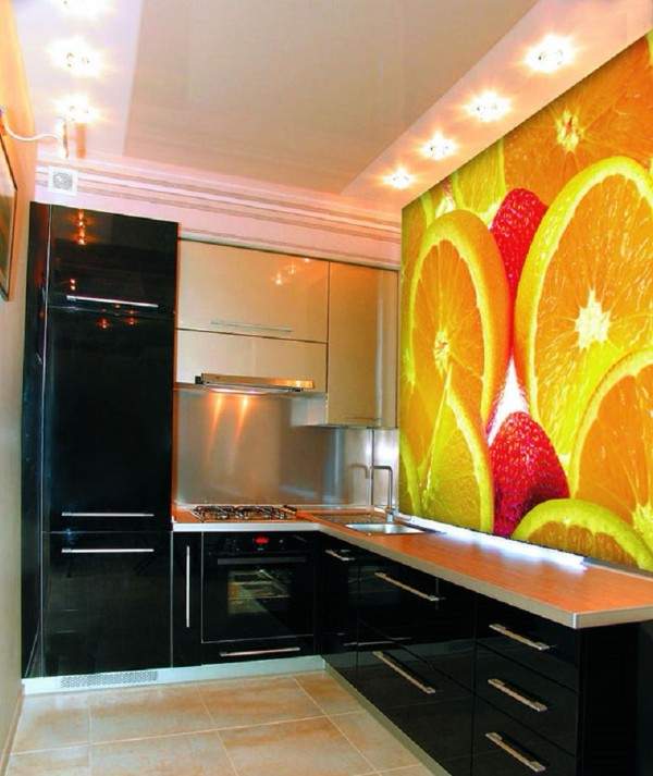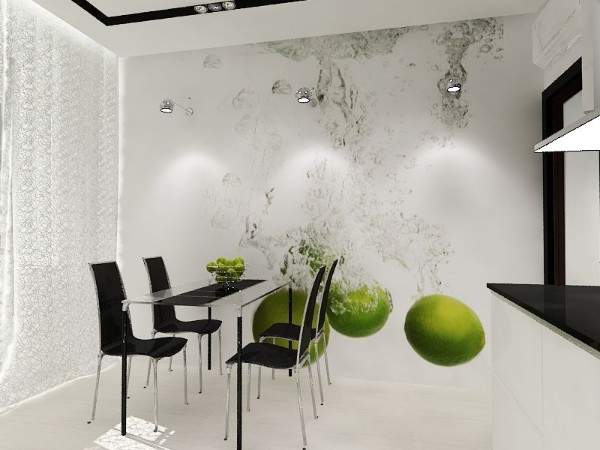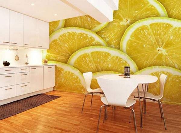 Но слишком крупный рисунок не прибавит красоты тесной хрущевке или маленькой кухне панельного дома. Гигантский лимон или помидор на стене превратится в непонятное яркое пятно, так как у вас не будет нужной дистанции для восприятия картинки.