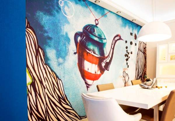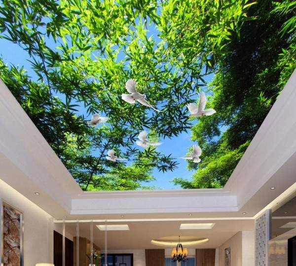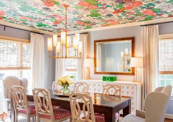 Реалистичная картинка голубого неба не только украсит, но и зрительно поднимет низкий потолок. На высоких потолках можно экспериментировать с рисунком более смело. Здесь уместны и цветочные, и абстрактные принты.