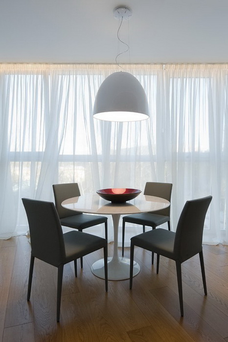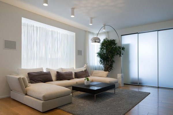 В предметах интерьера гостиной присутствует много лакированного блеска деталей. Пол светло — коричневого оттенка благодаря грамотно размещённому освещению передаёт комнате волну теплоты. Белые цилиндрические, потолочные светильники размещенные на одной поперечной оси прямо над диваном освещают зону общения, в дополнении к этому нельзя не заметить длиннющий арочный торшер, как жираф склоняющий голову к дивану сверху вниз.