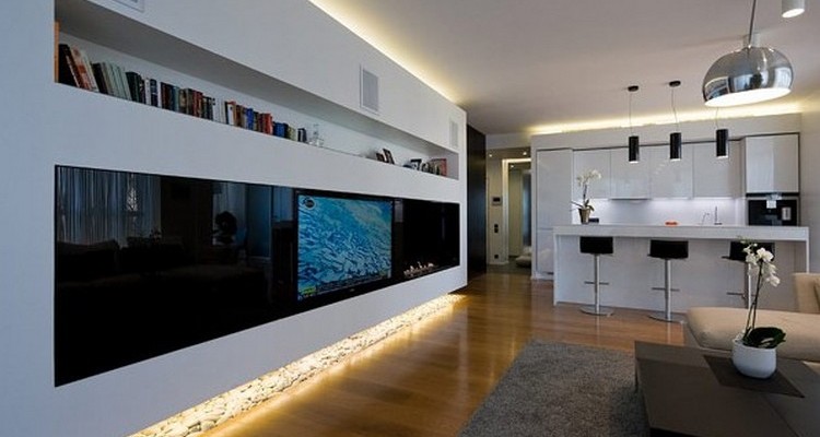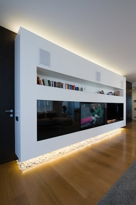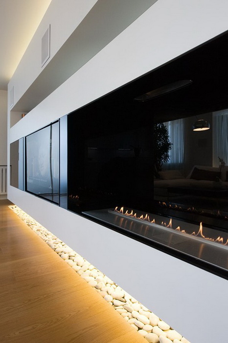 Уютную атмосферу в квартире, создает электрический камин в гостиной комнате. Он выполнен в том же современном стиле – сквозь металлические пластины, вырываются языки огня.