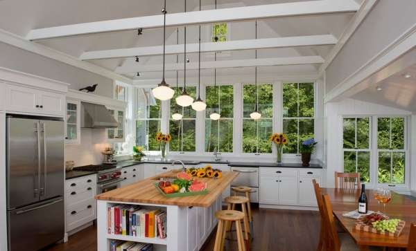 Новые идеи для интерьера кухни с окном в частном доме можно найти на следующих фото.